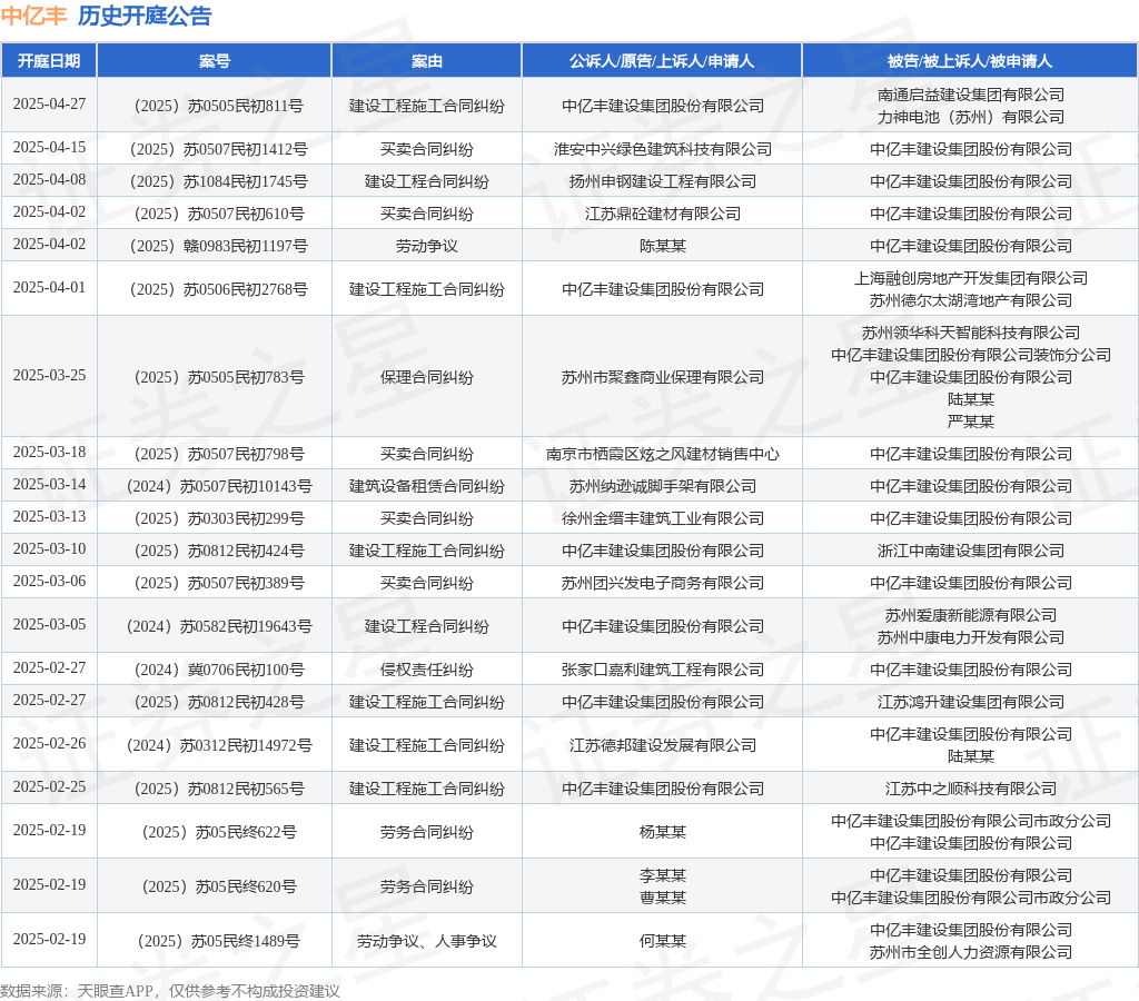 案号:(2025)苏05民终1489号审理法院:江苏省苏州市中级人民法院案由:劳动争议、人事争议当事人信息: 原告/上诉人:何某某 被告/被上诉人:中亿丰建设集团股份有限公司、苏州市全创人力资源有限公司开庭日期:2025年2月19日根据统计,近一年内以中亿丰建设集团股份有限公司为当事人的历史开庭公告有201则,其中案由为“建设工程施工合同纠纷”的公告以53则居首,其次为“劳务合同纠纷”有34则,“买卖合同纠纷”有24则。历史开庭公告(前20条)如下: